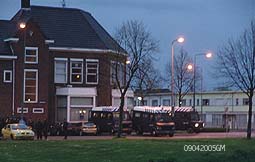 | Beide zijden van de wijk Bartjes -Zuid werd ook weer zondagavond hermetisch afgesloten. Alleen bewoners met pasjes of anderen die kunnen aantonen daar te moeten zijn , worden doorgelaten en eventueel gefouilleerd. | foto's gerard monté, 10 april 2005. |