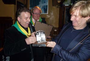 | -Boven: De Moeder Truus Poffer en de bijbehorende oorkonde gedragen door de gelauwerde Addy van den Krommenacker met rechts diens vriend Bas Meulenbroek, die het zilveren kleinood graag zou willen oppoetsen, maar wat op advies van Bèrt Verdonk wordt afgeraden. -Rechts boven: Een trotse Addy van den Krommenacker die van Bertie van den Heuvel de onderscheiding in ontvangst neemt. -Rechts: De versierselen, een miniatuur zilveren poffer die Addy mag houden, maar de grote zilveren poffer is een wisseltrofee, gaf Bertie van de Heuvel op vragen van Addy nog even expliciet aan. foto's © paul kriele, 9 maart 2011. |