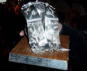 De zilveren Moeder Truus Poffer die genoemd is naar Moeder Truus Bosmans die de Kikvorschen, met name in de beginjaren, financieel en moreel heeft ondersteund en die hen een thuishonk bood in 't Pumpke. Ontworpen door de edelsmid wijlen Leo Lax. foto's © paul kriele, 9 maart 2011. |
