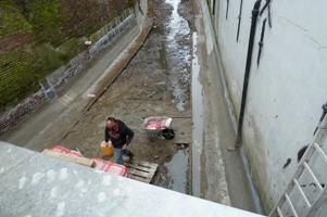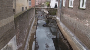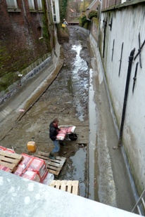 | Het traject langs de Parkeergarage St. Josephstraat en bibliotheek. -Rechts de opslag en bevoorrading vanuit een ponton gelegen onderaan de Bibliotheek. foto's © roland brouwer, 10 maart 2011. |