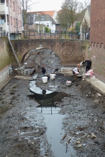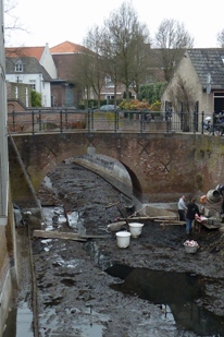 Uit de leeggepompte Binnendieze wordt tonnen afval afgevoerd, zolas straavuuil, bladeren, fietsen en ander rotzooi.