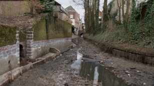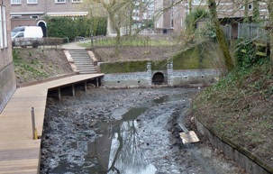 | De bocht bij de Schilderstraat [achterin de foto], waar de tak naar de Zuid-Willemsvaart rond1950 werd gedempt. | Zicht op een stukje Binnendieze richting de Geerlingse brug. foto's © paul kriele en roland brouwer [boven.], 10 maart 2011. |