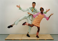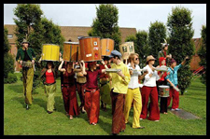 | -Links boven: de presentatoren Peer de Graaf en Miss Milly. -Rechts de perkussiegroep Lokomotiv uit Leuven. foto's © gerard monté, 4 april 2004 |