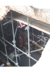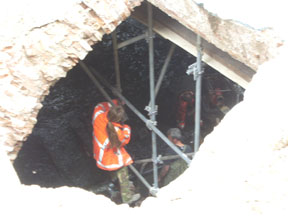 | De overkluizing van de Binnendiezetak die de Uilenburg met de Binnenhaven verbindt, ligt tijdelijk open. Eerst is er een rioolbuis weggehaald. Die wordt ter plaatse vervangen door twee nieuwe putten. Momenteel inspecteert een door de BAM ingehuurde medewerkster de toogmuren en de aanzetten en funderingen van die toog. Die gaan terug tot in de 15e eeuw, aldus Eddy Nijhof. Op de rechter foto's zijn binnen in de overkluizing medewerkers bezig de zaak in kaart te brengen. foto's © paul kriele, 26 augustus 2008. |