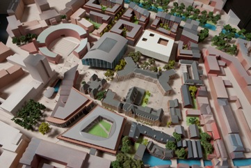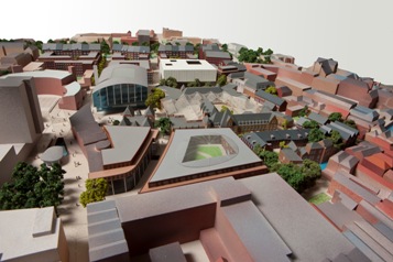 | In maquette: Zicht op het nieuw bebouwde GZG-terrein gezien vanaf de Markt/ Marktstraat. Links achterin de ronde Arena en rechts daarnaast de nieuw geplande Bijenkorf. Het witte blok is de nieuwe bibliotheek. |