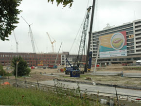 Hierboven: Twee maal het meest linker, ofwel de meest oostelijke vleugel. Links daarnaast loopt het tracé van de toekomstige randweg. De vrachwagen is bezig de restanten van de bomenrij, die langs de Vlijmenseweg stond, op te ruimen. Rechter foto: Vanaf het transferium kijk op het nieuwbouwcomplex van het JBZ. foto's © paul kriele, 27 augustus 2008. | ![]() |