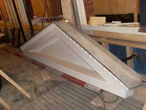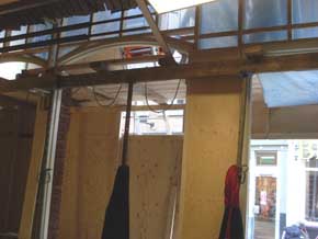 | De raampartij via een doorkijk van binnenuit gezien. De bogen boven en zijdelingse pilasters naast de ramen van de oude schoolgevel keren terug. | De timpaan van de oude school ligt al -opgeknapt -klaar. Die komt boven de winkeldeuren. foto 's © paul kriele, 29 september 2008. |