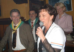 Monique Glaudemans die al zes maal deelnam aan de Kletsavonden en daarvan twee maal de eerste werd, zorgde voor een vrolijke sketch. Naast haar Bertie van den Heuvel, voorzitter van de Kikvorschen Achterin Hans Bosmans en diens echtgenote Nicole Bosmans-Renders. foto © paul kriele, 5 maart 2005. |