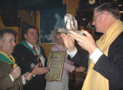 | Jo Timmermans toont de zojuist ontvangen Moeder Truuspoffer waarvan hij een kleine replica met oorkonde ontvangt. foto´s © paul kriele, 5 maart 2005. |