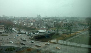 Het tegenwoordige Heetmanplein, gezien vanaf de Essentburelen. Na opening vande randweg zal het plein gereconstrueerd worden naar de rotonde-situatie van vóór 1969. Daar zal als het aan de gemeente ligt, geen molen terugkeren. Wat de relikten van de vestingwerken betreft, zullen alleen op en onder maaiveldhoogte ravelijnen en enveloppen en bastions zichtbaar worden gemaakt. |