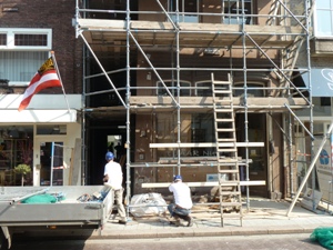 | -Boven: Marc Vrielink van de Vereniging Hendrick de Keyser en Harriën van Dijk van WVAU architecten bij de schouw die ze vandaag - 28 april 2011 - in het pand Hinthamerstraat 138 ontdekt hebben. -Rechts: kort na carnaval 2011 is daar de bouwkundige restauratie begonnen. -Rechts: Van Dijk en Vrielink bestuderen de bouwresten van de schouw. foto's © paul kriele, 22 en 28 april 2011. | ![]() |