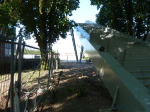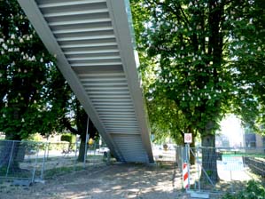| Zicht op de brugtrap zijde Isabellalaan, maar dan gezien vanaf de kant van de Randweg. | De twee overige brugdelen, te weten het loopvlak van 28 meter en de trap aan de zijde Randweg, worden op zondag 19 juni 2011 geplaatst. |