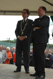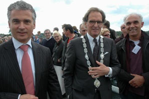 Ruud van Heugten burgemeester Roderick van de Mortel, burgemeester Ton Rombouts en Siebe Riedstra secretaris-generaal bij het Ministerie van Infrastructuur & Milieu [r.] . oto's © paul kriele, 15 mei 2011 |