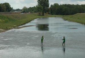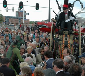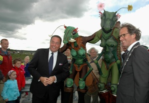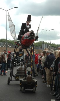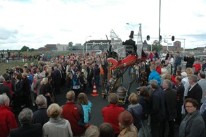 | Burgemeester Rombouts en collega Van de Mortel dragen twee door Kikvorsfiguren aangedragen Drongelens water naar de hilarisce stoommobiel. | De officiële opening voltrok zich op het viaduct in de Randweg over het Drongelenskanaal. Rombouts en Van de Mortel nemen hier van twee krekels de emmertjes water over. foto's © paul kriele, 15 mei 2011. |