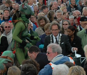 | De beide burgemeesters poseren voor de Kikvorsvrouwen. De Burgemeester van Vught [l] trekt een opgewekt gezicht door een kietelende kikvors. | Veel publiek en ook vele functionarissen waren op de opening en op de activiteiten afgekomen. |