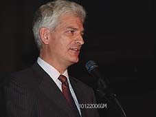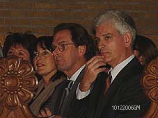 | Voorzitter Stefan Schuwer bij zijn welkomstwoord. | Burgemeester Rombouts en echtgenote en de voorzitter Stefan Schuwer van de Stadspijpers. |
