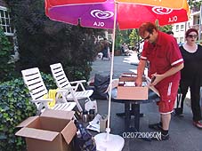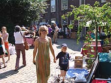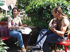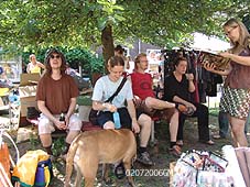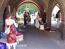 -Hierboven links: Marktwaar tussen het groen. -Boven: Muziek tijdens de handel. -Links: Even rusten na het slenteren.. foto's © gerard monté, 2 juli 2006. |