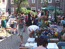 | -Boven:Koel onder de bogen, -Rechts boven: Drukte ondanks de warmte. -Rechts: De markt dijde uit tot buiten het hofje.. |