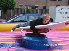 | Boven: Verfrissende muntthee, maar ook hamburgers lagen op een barbecue te sudderen. Rechts boven: Een surfvariant op de rodeostier. Rechts: Na een kanonschot gingen de ballonnen de lucht in. foto's © gerard monté, 25 juni 2006. |