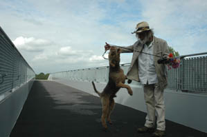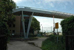 | -Boven: Cor Versteeg probeert op zijn dagelijkse wandeling met Coffy de brug al vroegtijdig uit. -Rechts: Spoorzicht vanaf de brug met rechts de tuinen van de Willem van Oranjelaan. | ![]() |