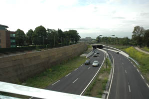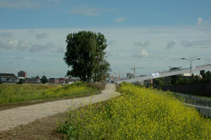 | Onder: twee maal zicht vanaf de brug, links richting Paleiskwartier en rechts richting De Heun met de tunnel onder het spoor. | foto's © paul kriele, 20 juni 2011. |