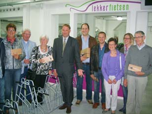 Groepsfoto rond wethouder Hoskam met de winnaars in de kelder van de fietsenstalling in de Kerkstraat. |