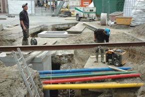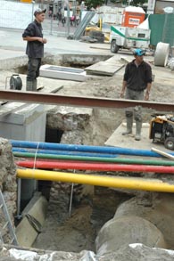 | Op beide foto's zijn de witte randen van de nieuwe rioolputten duidelijk herkenbaar. De putten zitten aan weerszijden van de Dieze -overkluizing naar de Binnenhaven. | foto's © paul kriele, 5 september 2008. |