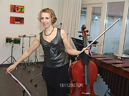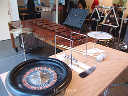-Links: Celliste Dorith Hochscheid -Boven: Instrumentarium voor slagwerker Win Konink: Marimba en roulettespel en Newtonslingers -Rechts: Werk van de componist Rachid A.l. Bougaily werd - in wereldpremiere- uitgevoerd door Dorit Hochsheid |