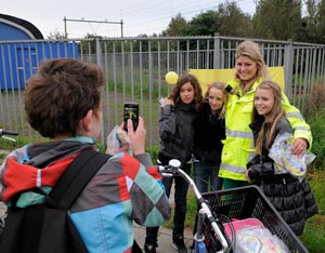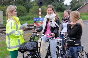 | Pauline Wingelaar van 'Echte Gooise meisjes' bij de Orthenseoverweg in gespek met enkele jongeren, die op weg zijn naar school. | De actie van Pro Rail bij spoorwegovergangen. Hier Orthen/Oude Rijksweg. |