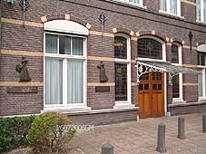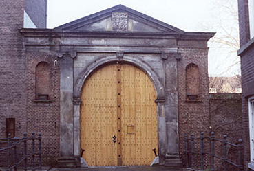De oorspronkelijke toegang [1661] waarachter meteen links de bakkerijen en wasserij stonden en links naast de poort de apotheek en verderop -boven het water -de kantoren van de Regenten van de Godshuizen nog staan, dateert van1661. De poort met timpaan, waarin het stadswapen werd meermalen gerestaureerd. Hier zijn de beelden van Elisabeth en Vincentius verdwenen. Er zijn later copieën voor teruggeplaatst. In 1928 werd de hoofdingang verplaatst naar de Nieuwstraat, waar nu nog de ingang poliklinieken is gesitueerd. foto © paul kriele, juni 1982. |