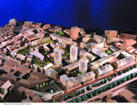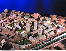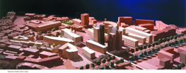 De ingescande maquette van David Mackay: van rechts onder naar rechts boven loopt het kanaal. Links onder het klooster dat in een uitgebreide opzet terugkeert,onder midden de slanke torenflats |