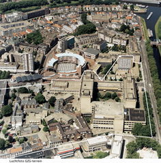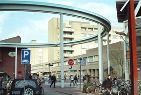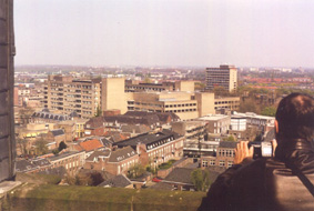 Een 'luchtfoto' van het gebied : middenin de torens van de verpleeggebouwen van het GZG. Rechts onderin de Openbare Bibliotheek t veel besproken klooster. foto © kees de kok 10 april 2002. |