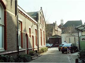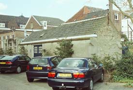 Hierboven een oud gebouwtje dat staat op een van de percelen van de panden in de Nieuwstraat. Rechtsboven: Op het binnenterrein staat ook het stervormige voormalige verpleeggebouw dat voor de ontwerpers een sta-in-de-weg betekent. Kklooster en kapel bijven gehandhaafd en krijgen mogelijk een functie van documentatie/informatiecentrum. foto's © paul kriele, 28 maart 2006. |