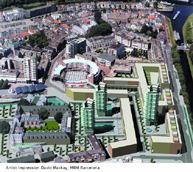 Die bezoekers hadden niet erg veel commentaar op de invulling en zien de aansluiting met de historische binnenstad als een uitgesproken kans. Sfeertekening van nieuwbouw GZG-terrein door Bureau MBM architecten Barcelona.