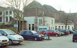 Boven: De markante toegang tot de Arena met daarachter het GZG dat in 2009 wordt gesloopt om plaats te maken voor een nieuw stadsgedeelte. En doorkijk naar flat op Burg. Loeffplein met links de voormalige apotheek en rechts het oude klooster. Links: aan de rechterkant de achterzijde van de Nieuwstraat en middenin - achter de boom -de poli's aan de Nieuwstraat. foto's © paul kriele, 28 maart 2006. |