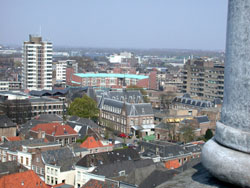 | Links de torenflat op het Burg Loeffplein en middenin de foto het klooster van het GZG. Daarachter de Arena. oto© kees de kok, 10 april 2002. |