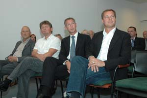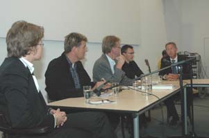 -Links: vlnr.: Gerard van Maasakkers, die in een treffend lied over het drama van de geïsoleerde gevangenen in Kamp Vught weergaf. Naast Van Maasakkers diens begeleider Harry Hendriks en vervolgens gedeputeerde Onno Hoes en Albert Verlinde. -Links onder: De samensteller van de expositie 'Wie kan ik nog vertrouwen', Klaus Muller. -Onder: Voorafgaand aan de opening was er een panel olv Tony van der Meulen [columnist Brabants Dagblad], dat inging op historische, meer nog op actuele vragen over geweld tegen, name mannelijke, homo’s. Vlnr Anna Thijssleing [Hem Fusion] , prof. dr. Alfred Boekhorst [Int. homo en lesbian Infocentrum en archief], Tonny van der Meulen [columnist Brabants Dagblad], Klaus Müller en Onno Hoes. foto's © paul kriele, 7 september 2007 . |