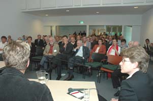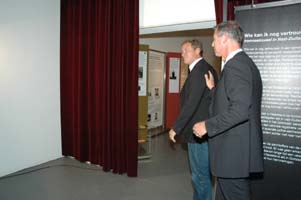 | -Boven: Overzicht van de grote publieke belangstelling in Nationaal Monument Kamp Vught voor deze opening en expositie. -Rechts: Onno Hoes en Albert Verlinde openden na een paneldiscussie de tentoonstelling die tot 10 januari 2008 loopt. foto's © paul kriele,7 september 2007. |
