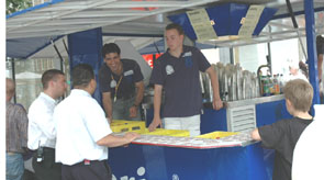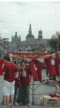 | Boven: Paul Offerman. Rechts: T-shirt en programmaverkopers op de Pensmarkt Sam en Rick van Riel [r. en m.] en Thijs Busser [l]. foto's © paul kriele, 15 juli, 2007. |