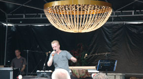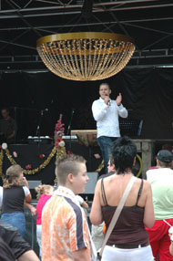 | Hier en daar stonden EHBO-hulpposten en wc's. Het Bavariabier werd rijkelijk getapt. | Boven en onder: Christian uit Breda op het podium smartlappen tijdens zijn beoordeling door de jury olv presentator Hans Tervoort. |