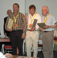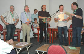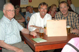 -Boven: de drie bestuursleden, die afscheid namen [boven] en bij hun benoeming tot lid van het nieuwe 'Genôôtschap van de vetleren medaille'. vlnr: Lambert van de Wiel, gastheer voor de organisatie, Harry van den Berselaar [tekstschrijver] en voorlezer Danny van Nimwegen. -Links: De afsluiting van de 12e editie van het Grôôt Bosch Dictee: De Checolade Mupkes met Wilma van Dartel [r] en Marij van Heijsten [l]. foto's © paul kriele, 25 april 2007. |