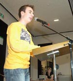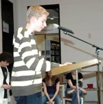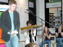 Hierboven [in volgorde van optreden]: vlnr. Coen de Jong, Viviane Geurts [1e prijs op inhoud door de verbeelding van haar gedicht], Rick Stuart, Jeroen Heessen met 'Pietje Parkietje, waarmee Jeroen een eervolle vermelding kreeg, en Jolie Keemink. foto's © paul kriele, 2 april 2007. |