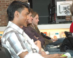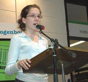 -Links boven: de zaal met op de eerste rij 6 genomineerden voor de halve finale. -Boven: Enkele toeschouwers. -Links: De jury met o.a. rechts Erik Jan Harmens en Hagar Peeters, die bekend is om haar bundels 'Genoeg gedicht voor vandaag' en Koffers zeelucht, waarvoor ze de J.C. Bloemprijs won. foto's © paul kriele, 2 april 2007. |