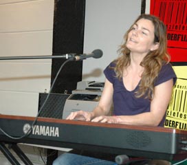 | Hieboven de zaal met presentator Dries. Midden en rechts: het optreden van Marlies Somers die zich profileerde als een volleerd cabaretiere [eerder meegedaan met Lowlands]. foto's © paul kriele, 2 april 2007. |