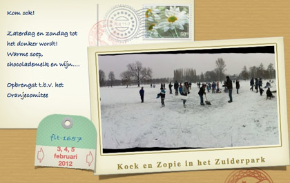 Op zaterdag 4 en zondag 5 februari 2012 is het grasveld ih het Zuiderpark een ijsbaan. Daar wordt voor warme drank gezorgd. De opbrengst gaat naar het Oranjecomité. |