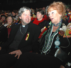Lathouwers richtte ook zijn pijlen op bisschop Mutsaerts, bij wie 'Liefde overal is...'. De hulpbisschop zat op rij 9 in de zaal. Na een inleiding over de voorgangers van de bisschoppen Bluyssen en Bekkers, stelde de Bossche entertainer aan Mutsaerts de vraag: