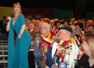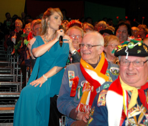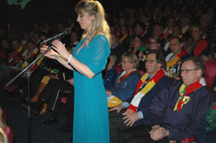 | -Boven links en rechts: Het TheateradParade zat overvol, waarschijnlijk zo'n kleine 1300 Oeteldonkers. Onder wie bisschop Rob Mutsaerts, gezeten naast Rina Chappin-van de Ven. -Rechts: ster Joke de Kruijff begon haar optreden in de zaal staand voor o.a. burgemeester Ton Rombouts. Met 'I'lI Be seeing you' raakte zij- door een intense mooie stem - de zaal. Naast Rombouts [rechts] zit gedeputeerde Y.de Boer en links van Rombouts de gedeputeerde Birgitte van Haaften. Behalve Rombouts waren ook de wethouders Geert Snijders, Bart Eigeman, Huib van Olden en oud-wethouder Bert Pauli present. |