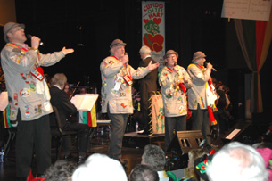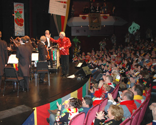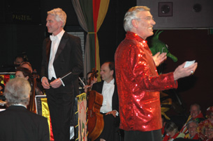 | Spreekstalmeester Piet Lathouwers begon zijn conference met een mop, waarin hij het verschil aangaf tussen een voetbalelftal en het Oetelkonzert: Het antwoord was: de achterhoede. | In zijn conference pakte hij het Orkest op als 'Ons Brabants Orkest, ofwel OBO, in plaats van Het Brabants Orkest [HBO]. foto's © paul kriele,14 februari 2012. |