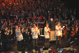 Koster en De Kruijff gebruikte het hele toneel en ook de tjokvolle toneeltribune achter het orkest, dat zoals elk jaar het meest ontstuimig meedeed. foto's © paul kriele, 14 februari 2012. |