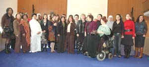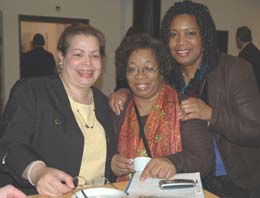 -Boven: Indruk van de raadzaal op de Internationale Vrouwendag 2007 in het Bestuurscentrum, waar zinnig werd gediscussieerd en becommentarieerd op de vijf- door een van de 39 raadsleden- ingediende items. Vrouwendag08032007pk.jpg -Rechts boven: vlnr Shiry de Vette, Edith Yard en SandraTeemen, die penningmeester is en de sponsorbehartiging doet namens organisator het Vrouwennetwerk. Edit Yard is een ondernemende vrouw. Edit is Lid van de Zwarte Zakenvrouw, schrijfster van de roman 's Morgens vroeg' en lid van de Federatie Vrouwen Nederland. -Rechts :een hoekje in het Bestuurscentrum, met enkele bezoeksters die gastvrijheid genoten van de Gemeente 's-Hertogenbosch.. -foto's © paul kriele, 8 maart 2007. |